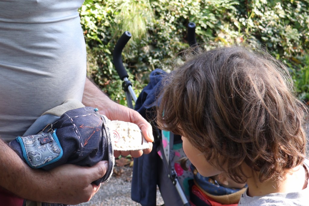Une randonnée de trois heures, avec un peu de dénivelé et de soleil. Vous devrez vous orienter grâce au parcours cousu sur le sac et vous découvrirez des indices dans le sac et dans le paysage. Un livre d’indices vous accompagne en cas de doute. Le descriptif du jeu est traduit en anglais.
